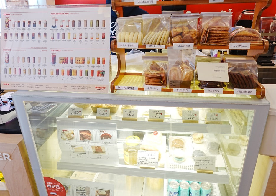 - 디저트 라인업: 쇼케이스에는 커피와 찰떡궁합인 쿠키와 조각 케이크 등 다양한 디저트류가 준비되어 있었습니다. 당 충전이 필요하신 분들은 조각 케이크 한 조각 곁들이시면 완벽한 오후가 될 것 같네요!